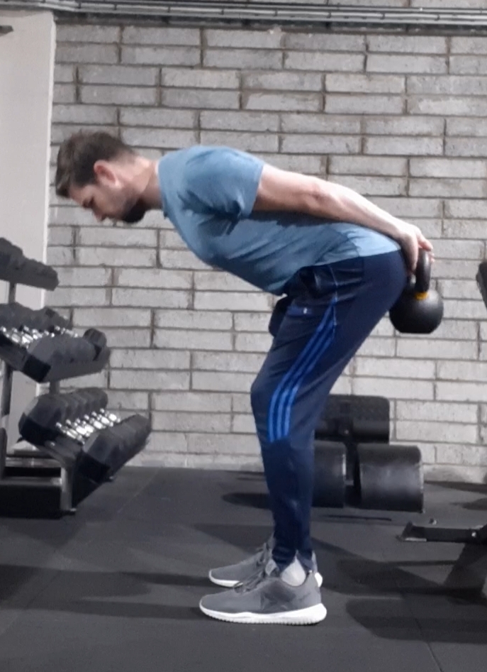 To target these muscles effectively you need to hinge at the hips. The picture below shows what this needs to look like. Bending (flexing) at the hip more than the knees.