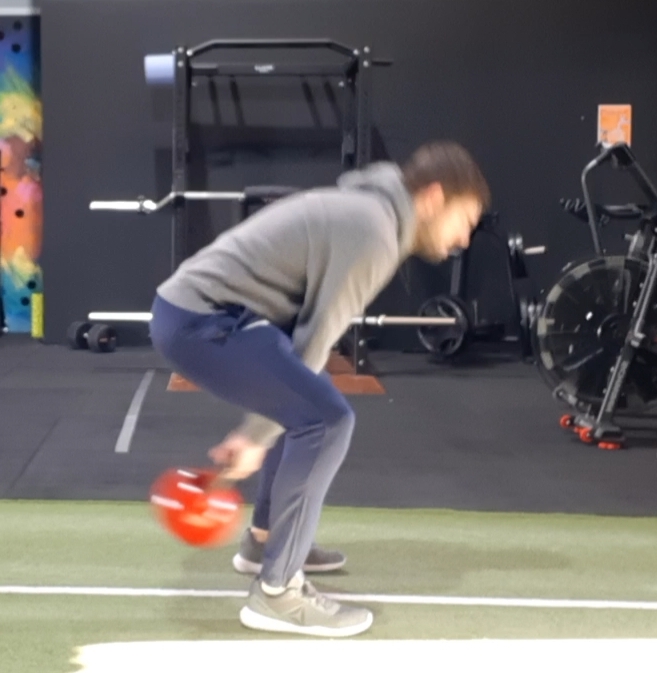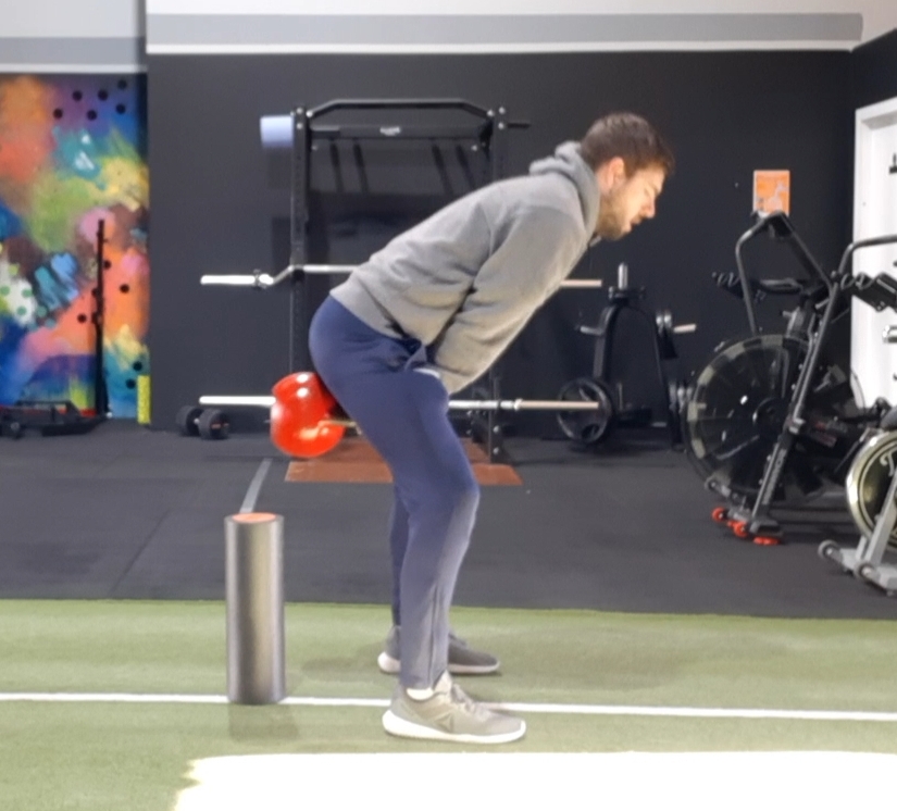 You can see from the picture above that the knees are only slightly bent and if they were to bend more, into a squatting movement pattern, and lowering the bell then the roller will be hit and fall over.