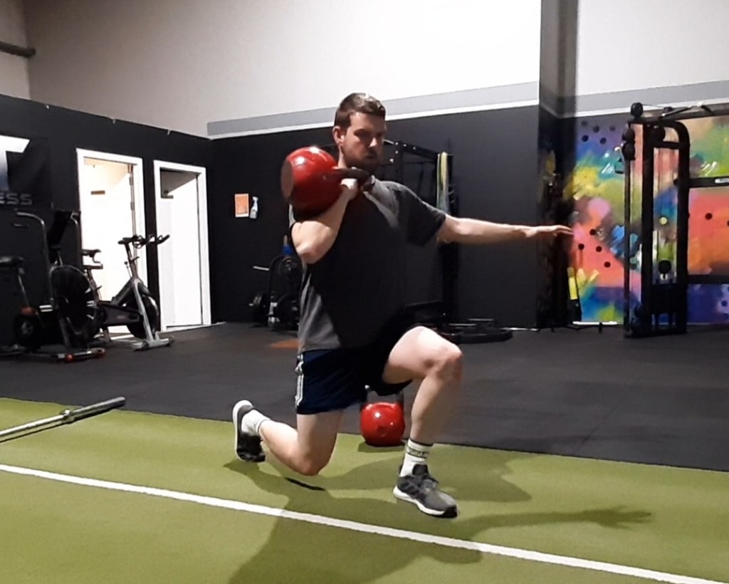 Holding the weight in the rack position, as pictured, on one side only again forces the core and hip muscles to stabilise the load and avoid losing balance.